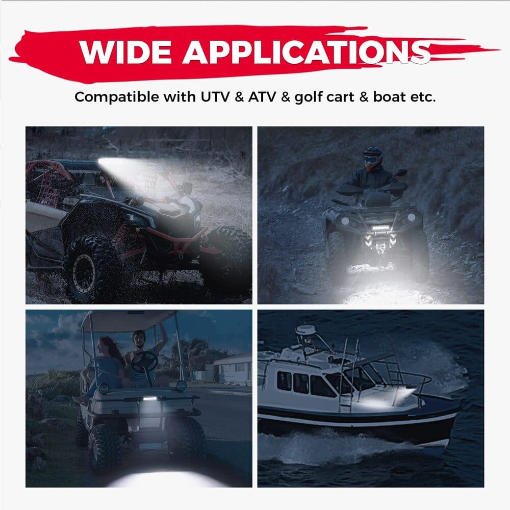 The utility LED light bar is Compatible with ATV, UTV, Compatible with Can-Am, SxS, 4x4, Car, Off-Road Vehicle. LED light bars can be used as dome Light, Interior light, overhead courtesy Light, and underhood Light. Can be mounted on roll bar, roll cage, top bar, sun visor, back rail of the cab, side of the door, front bumper, and wherever you need it.