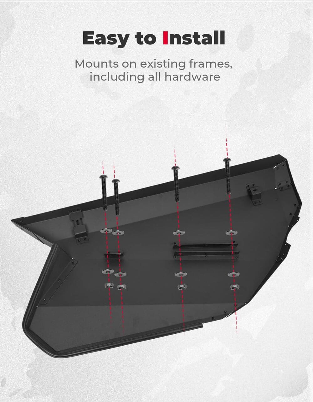 The Can-Am X3 full doors, made from durable aluminum, offer excellent protection against rocks, and mud, ensuring a cleaner, warmer ride. Easy to install without drilling, they include all necessary accessories and provide a snug fit with noise-reducing rubber pads!