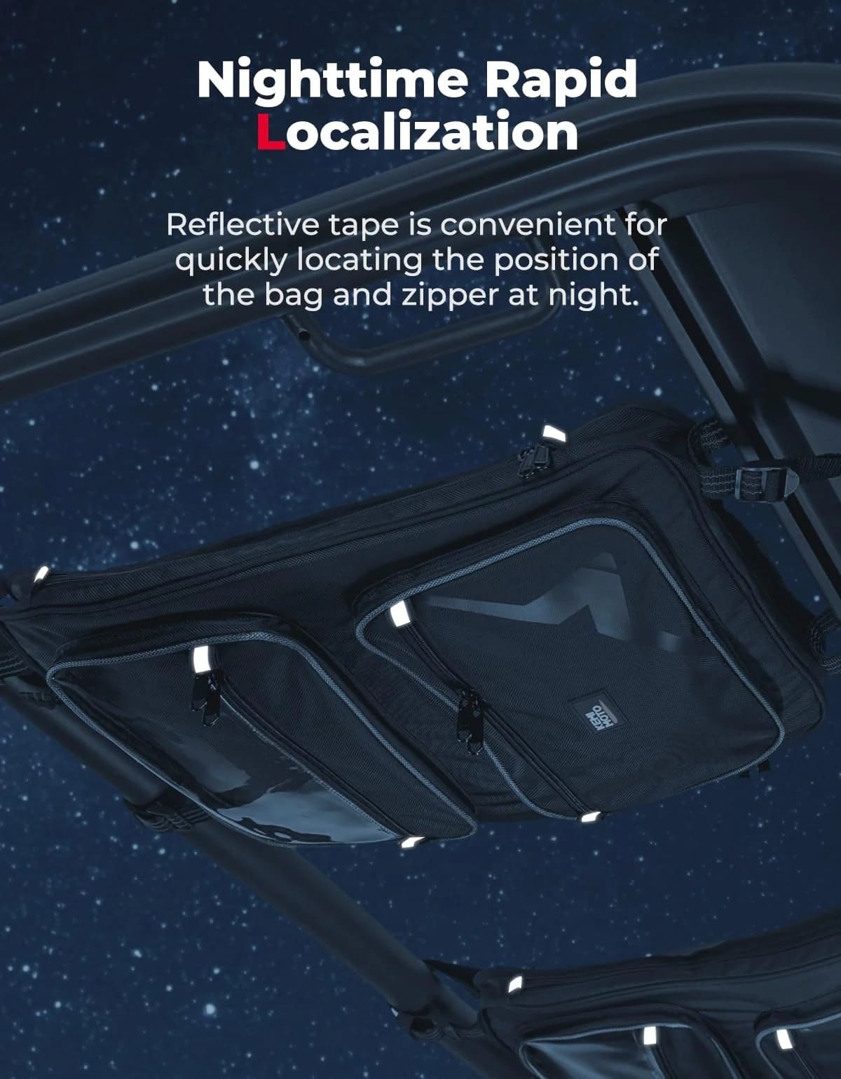 CFMOTO UForce overhead bag is designed to fit perfectly with your roo. Mounted on the roof roll bar, it gives you extra space without taking up room inside. Store your tools, maps, and phones easily. Made from water-resistant PVC fabric and tough 1680D Oxford cloth, it's built to last through rain, snow, and scratches. The special design includes easy-access side pockets, anti-slip mesh, and reflective straps for night use. Installation is super simple no tools or drilling are needed. Just strap it on and go! Grab yours now and upgrade your ride with extra storage.