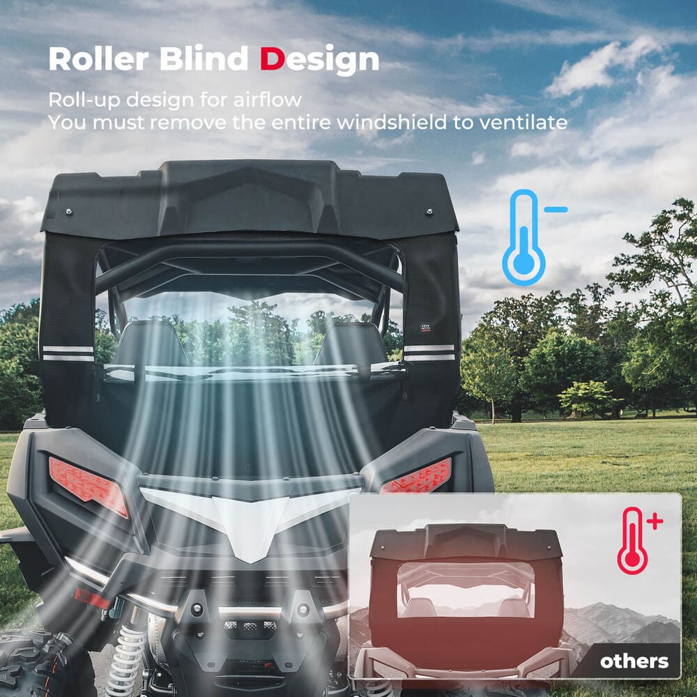 - Dust Proof: Z FORCE 800 windshield helps keep the dust out when riding on a trail. Without a dust barrier, the dust and cold air can blow into the cab and make you feel terrible. Moreover the soft windshield will be much cooler than solid windshield.