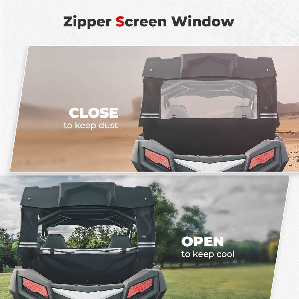 Double Zipper Design: This Z FORCE rear window is designed with double zipper, inside and outside the window. Which can easily open and close the zipper from the cab or outside the utv without the need for assistance. And PVC coating on the outside of the zipper so you don't have to worry about the zipper getting dirty and wet.