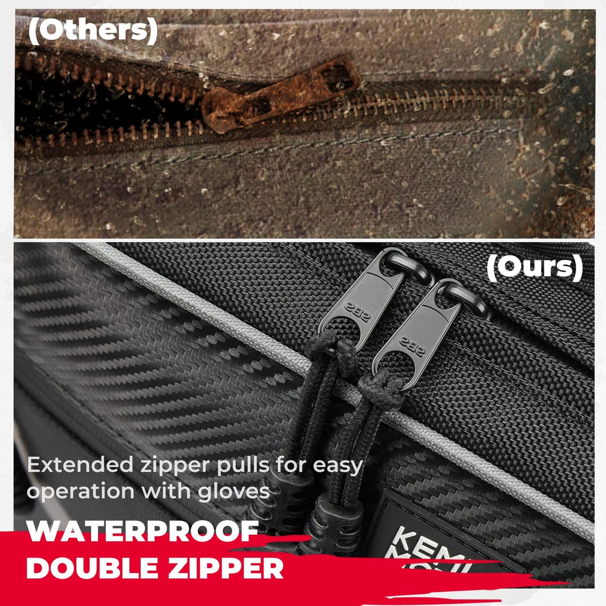 - Waterproof Double Zipper: These lower door bags are designed with a double-ended waterproof zipper. Extended zipper pulls for easy operation with gloves. With 1680D water-resistant material, so mud and rain do not easily penetrate the bag.