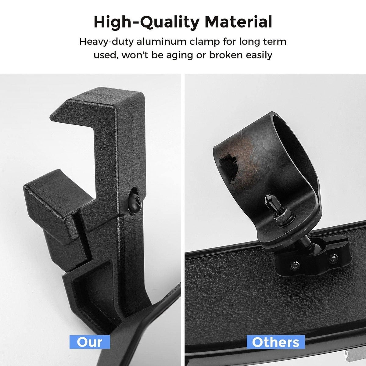 The outer shell of Kemimoto center mirror is made of high-quality ABS plastic with textured black powder coating, which is durable and corrosion-resistant for long-term use. You can install the utv rear view mirror on 1.5"-1.875" roll bar cage, which can keep the mirror stable without shaking even if you are driving fast on a rugged road.