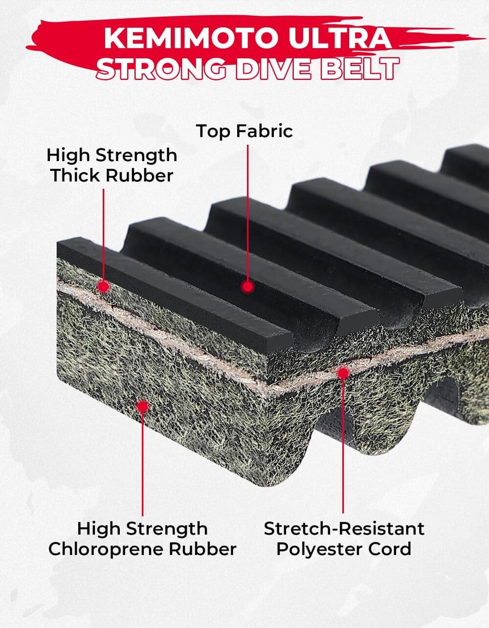 kemimoto drive belt for UTV CVT belts is made of high-quality neoprene and advanced polyester cord, has better heat resistance and heat dissipation, built specifically for extreme abuse, excessive shock load, and high temps!