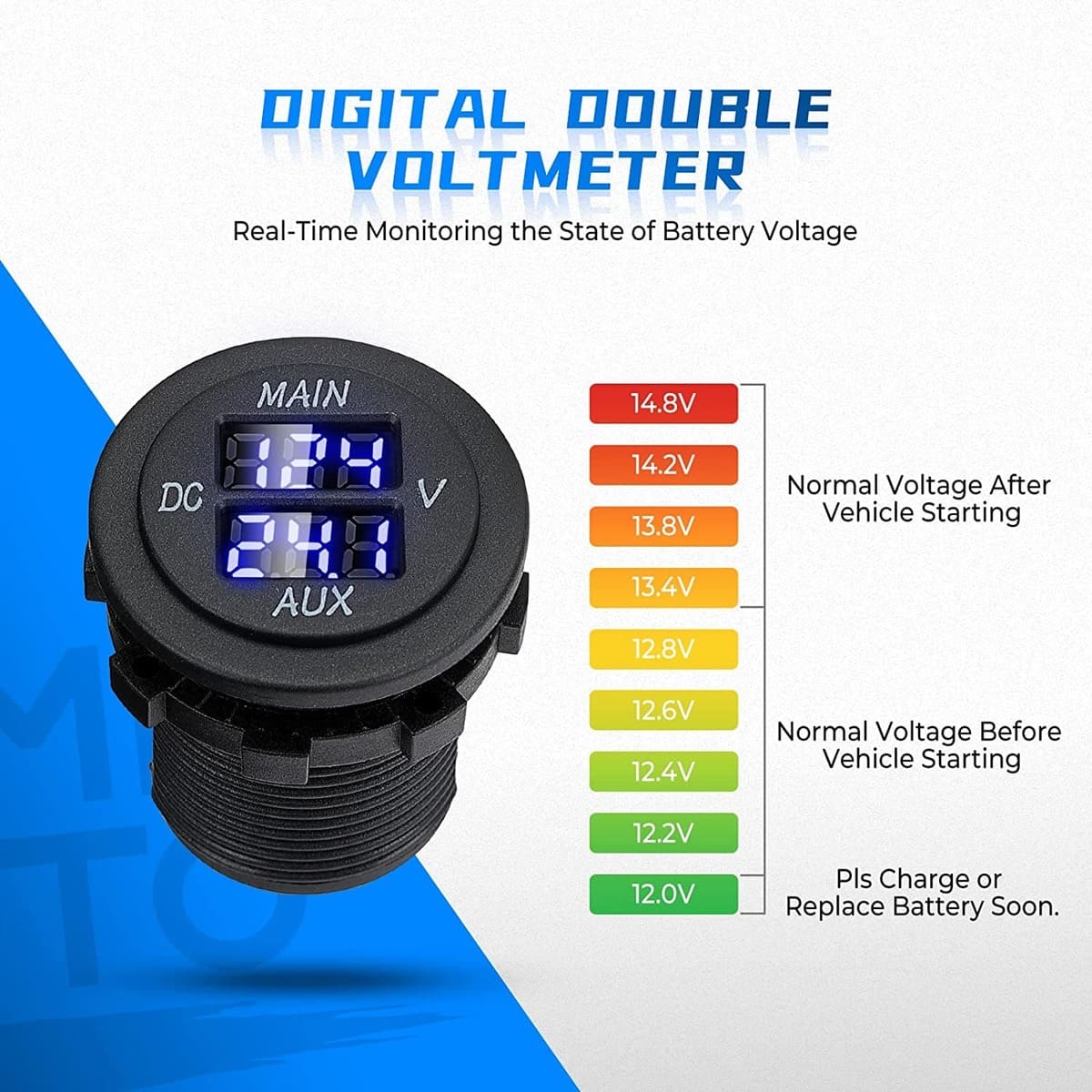 LED Digital Double Voltmeter: Round panel voltage monitors the 2 battery packs of the vehicle in real time, reminds you to charge or replace it in time, and better avoid battery exhaustion when starting the car engine.