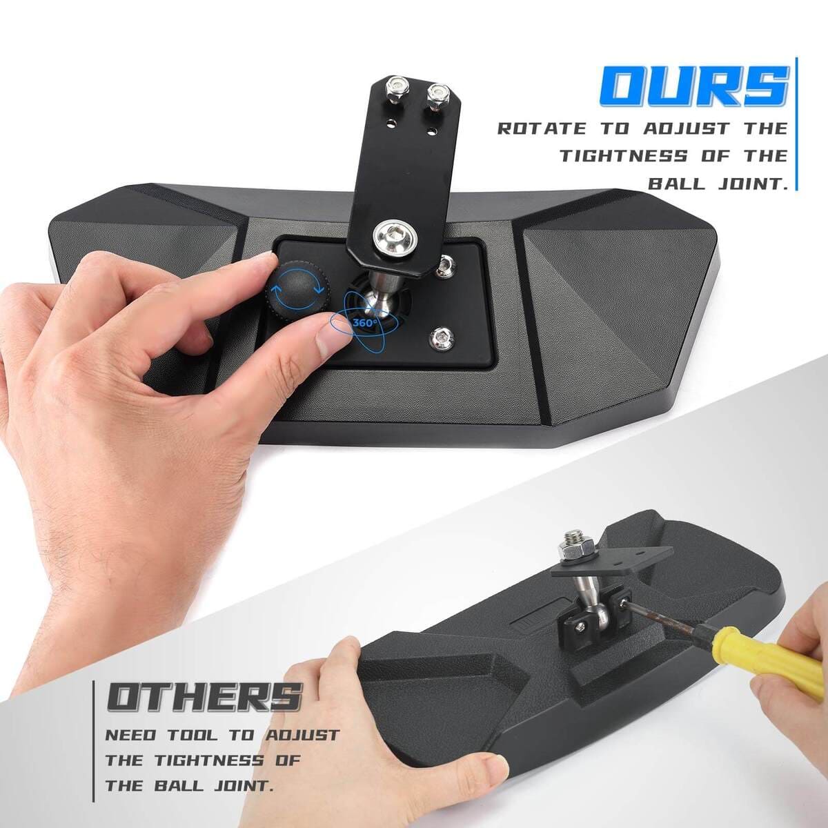 Adjusted with Thumb Screw: The joint ball can be adjusted by thumbscrew without tools easily. The joint ball can be rotated 360 degrees to fit your need, and it will stay in place when you tighten the screw.