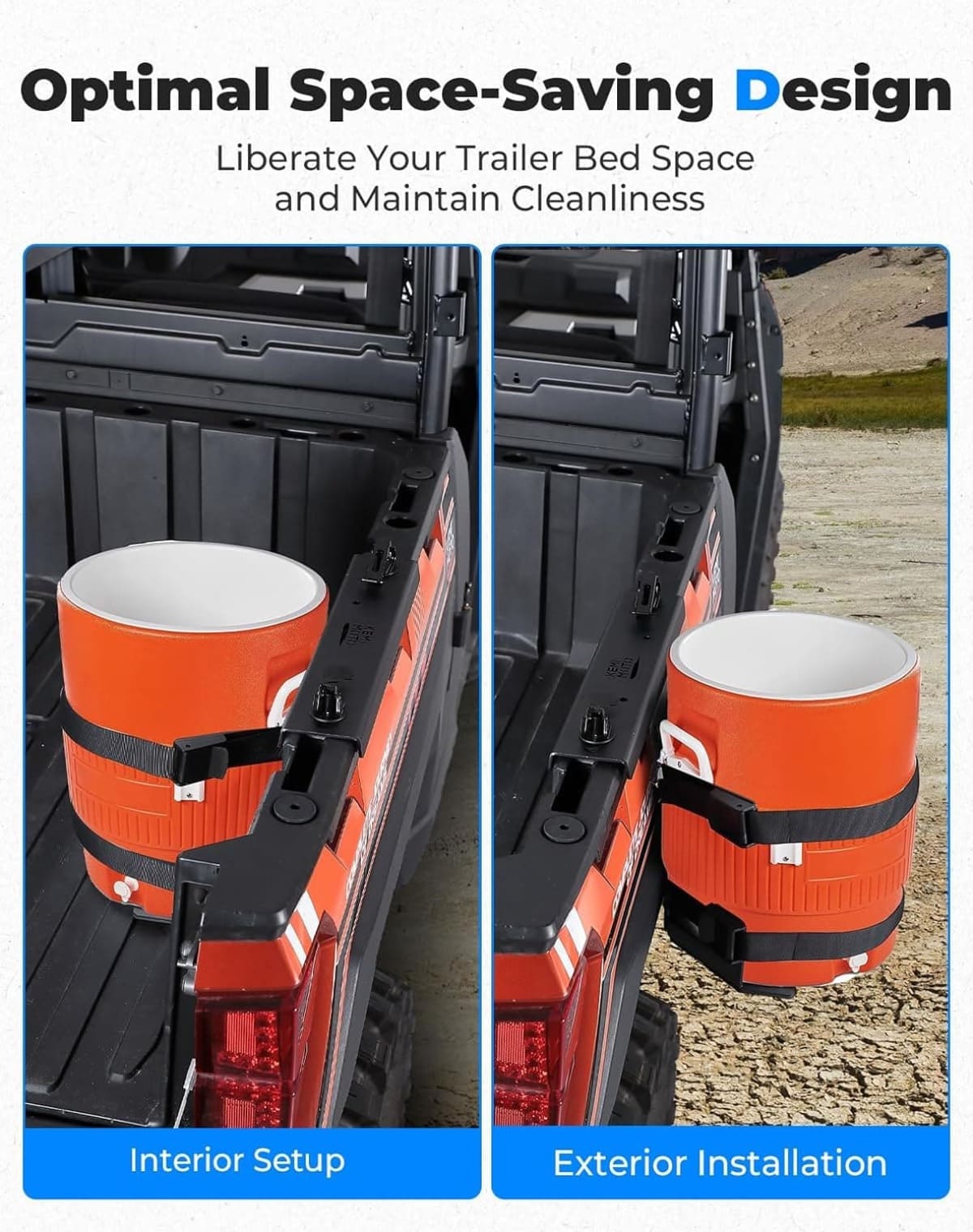 5-Gallon Cooler Holder with Adjustable Straps for UTVs: This adaptable cooler holder is designed to secure almost any 5-gallon water cooler, using two adjustable straps (59" x 1.5") to firmly grip containers ranging from 4 to 24 inches in diameter. Ideal for coolers, paint buckets, and various other items.