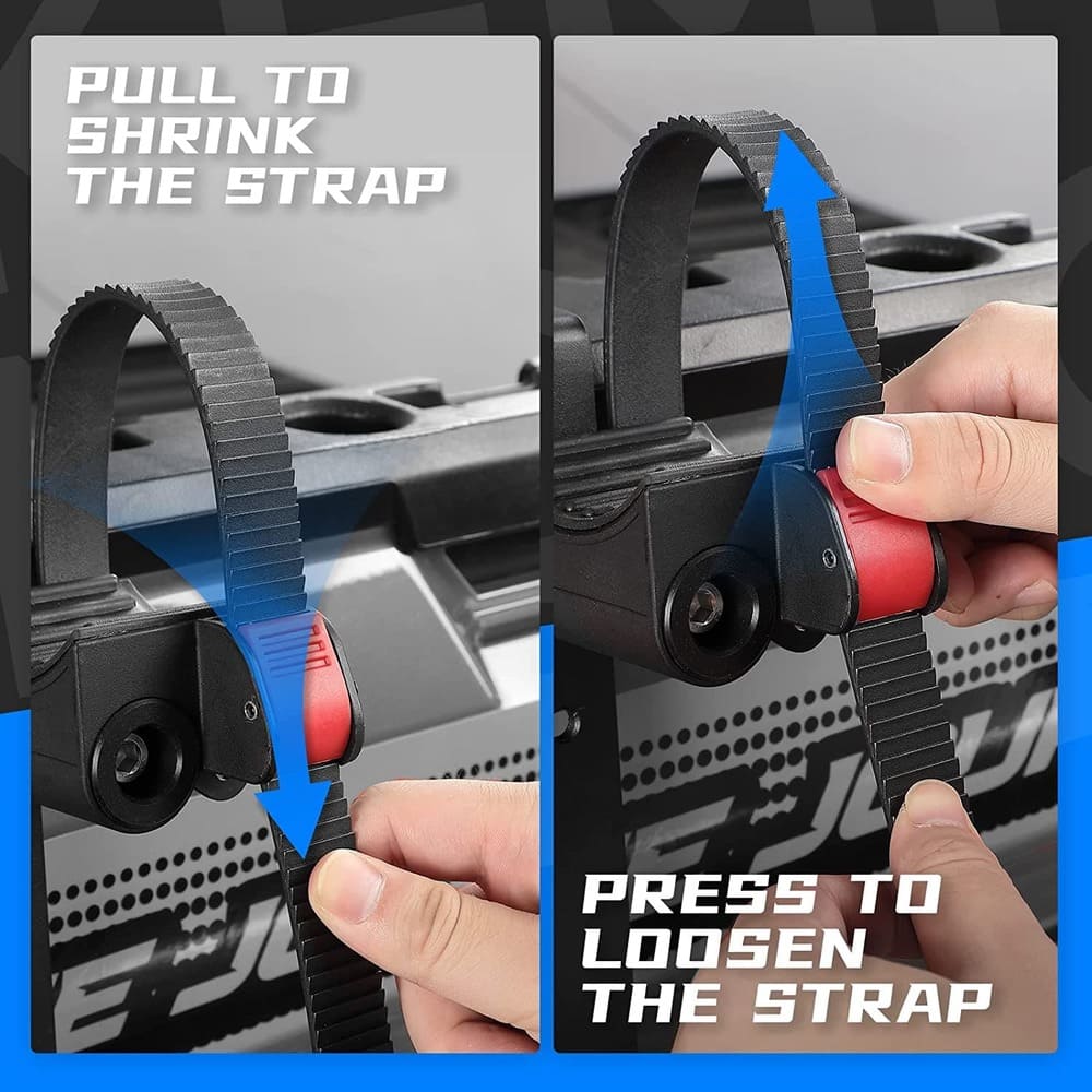 Adjustable Strap Provides Large Space: Loosen the strap by pressing and tighten the strap by pulling it down. The strap's diameter of the General tool rack is 20mm-80mm.