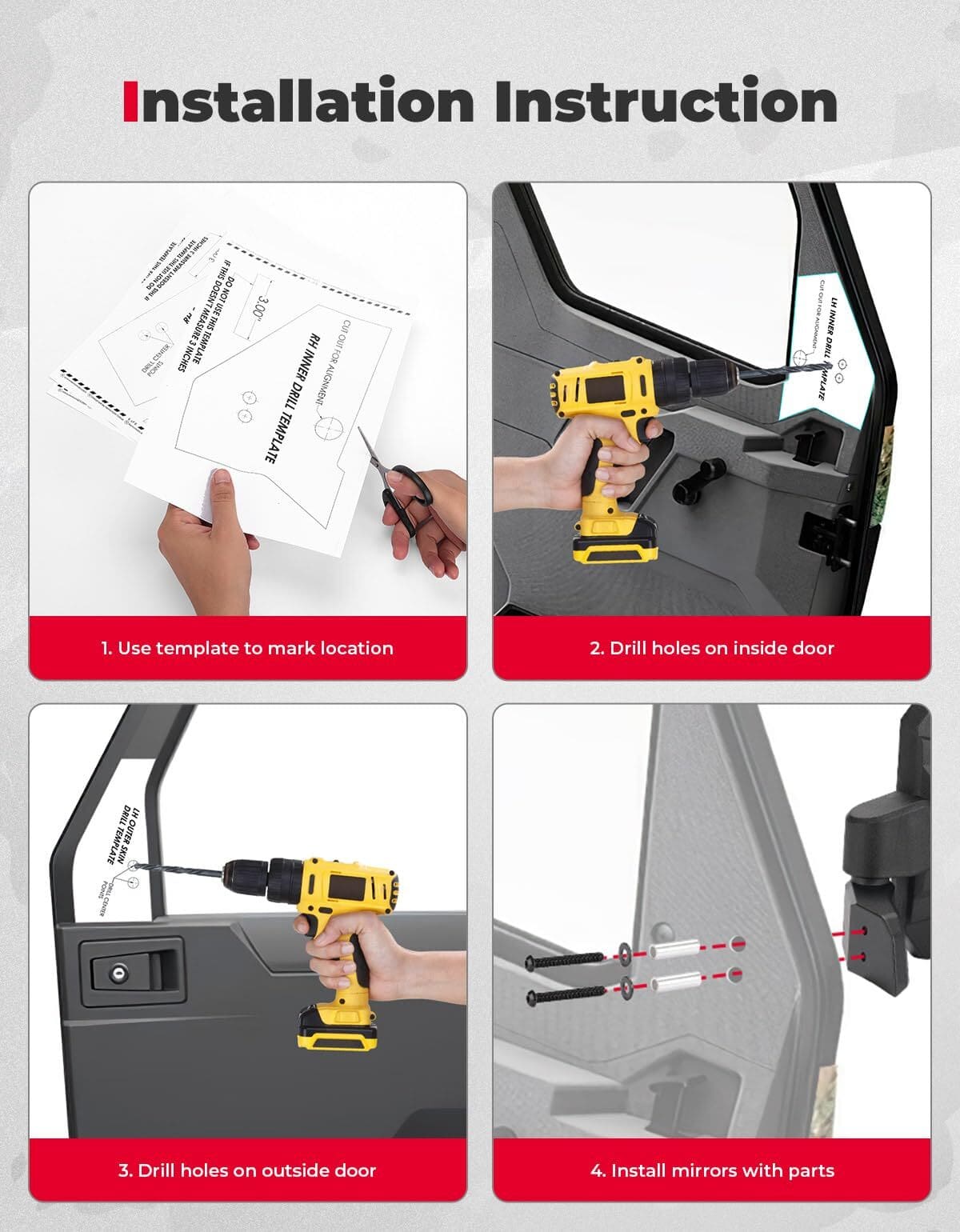 - Easy Installation for Different Models: As for 1000 and XP 1000 Models, simply use the template to mark the location of the mirror on your UTV door, drill the holes, and attach the mirror with the provided hardware; As for Midsize Models, remove two caps from inside doors and drill holes. Install the mirrors with parts and reinstall two caps. *Reminder* Different Models are equipped with different parts.