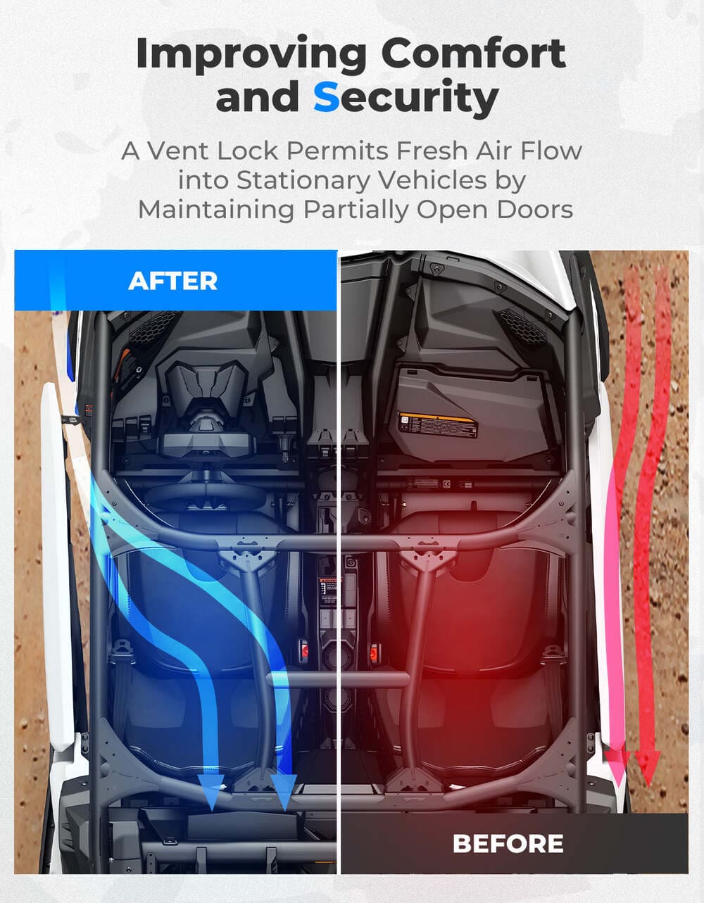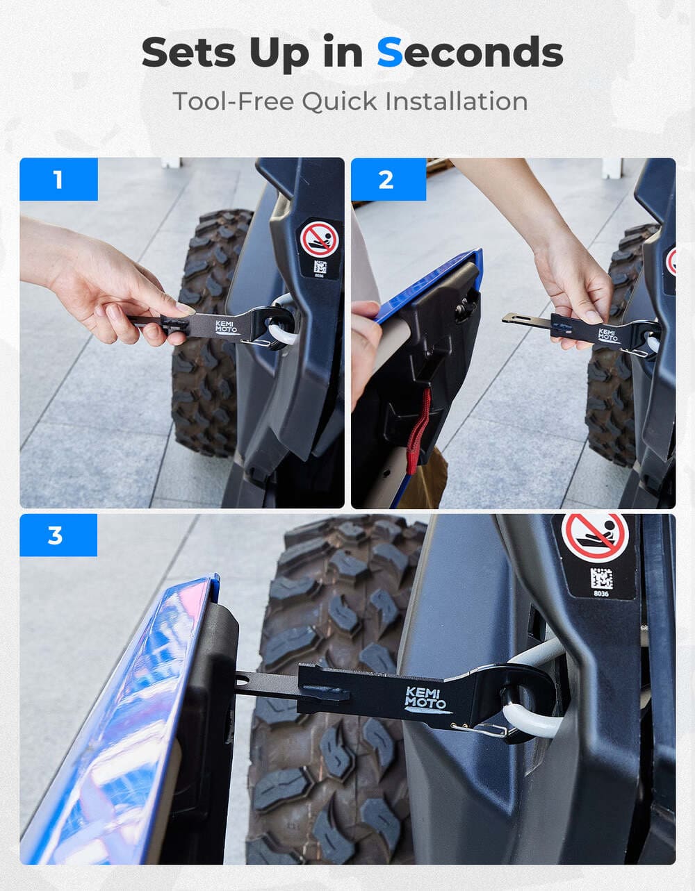 Upgrade your ride with Kemimoto UTV door latches. These innovative door latches can enhance airflow to keep the cabin cool during your adventures. The noise-reducing coated design ensures a quieter ride, even on rough trails. With a tool-free, quick setup process, these latches are easy to install and use. Perfect for improving comfort and functionality, the UTV door latches are a must-have accessory for any off-road enthusiast.