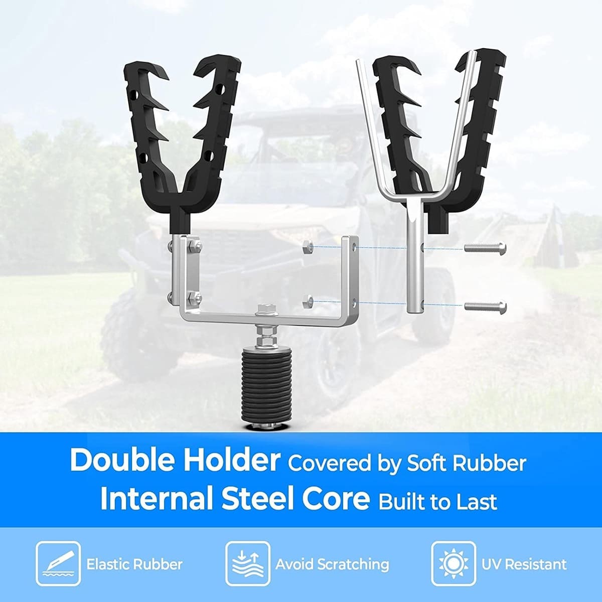 The Kemimoto UTV Tool Rack is a versatile hunting tool holder and mount, designed for compatibility with Polaris Ranger and General models. Equipped with secure bow holder grips and rubber snubbers, this robust tool rack ensures your gear stays safe and organized during your outdoor adventures.