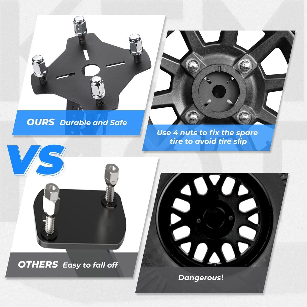 Keep Organized & Safe: Kemimoto spare tire carrier mounts to the cargo bed. Keep quiet on the trail, no rattles or squeaks. You do not need to drill, take up hitch mount, or attached spare to a roll cage.