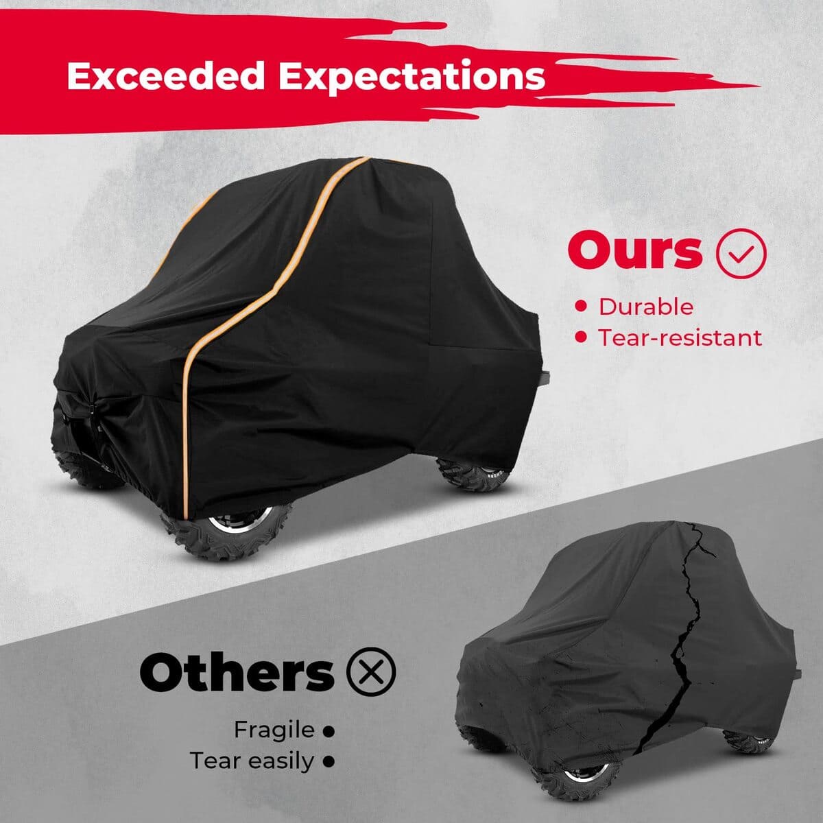 - Strong Protective & Durable: Our cover waterproof strips seam with double-stitched, which is not easy to seep even under 2400 Pa water pressure and durability in harsh weather. The cover is designed with an adjustable elastic cord at the bottom, which allows it to adjust to the suitable size easily. It also has strong UV protection making the UTV anti-aging and more durable.