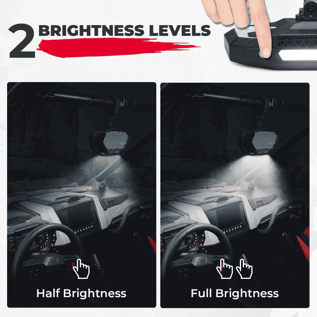 Super Bright Led Light & Push Button Switch: The UTV center mirror goes with high brightness but low energy consumption, which extends the time use after charging is completed. The lamp provides a 6,000K clear white light view and is waterproof and dustproof by the structure design. To facilitate customer usage in different scenarios, two brightness levels are designed.