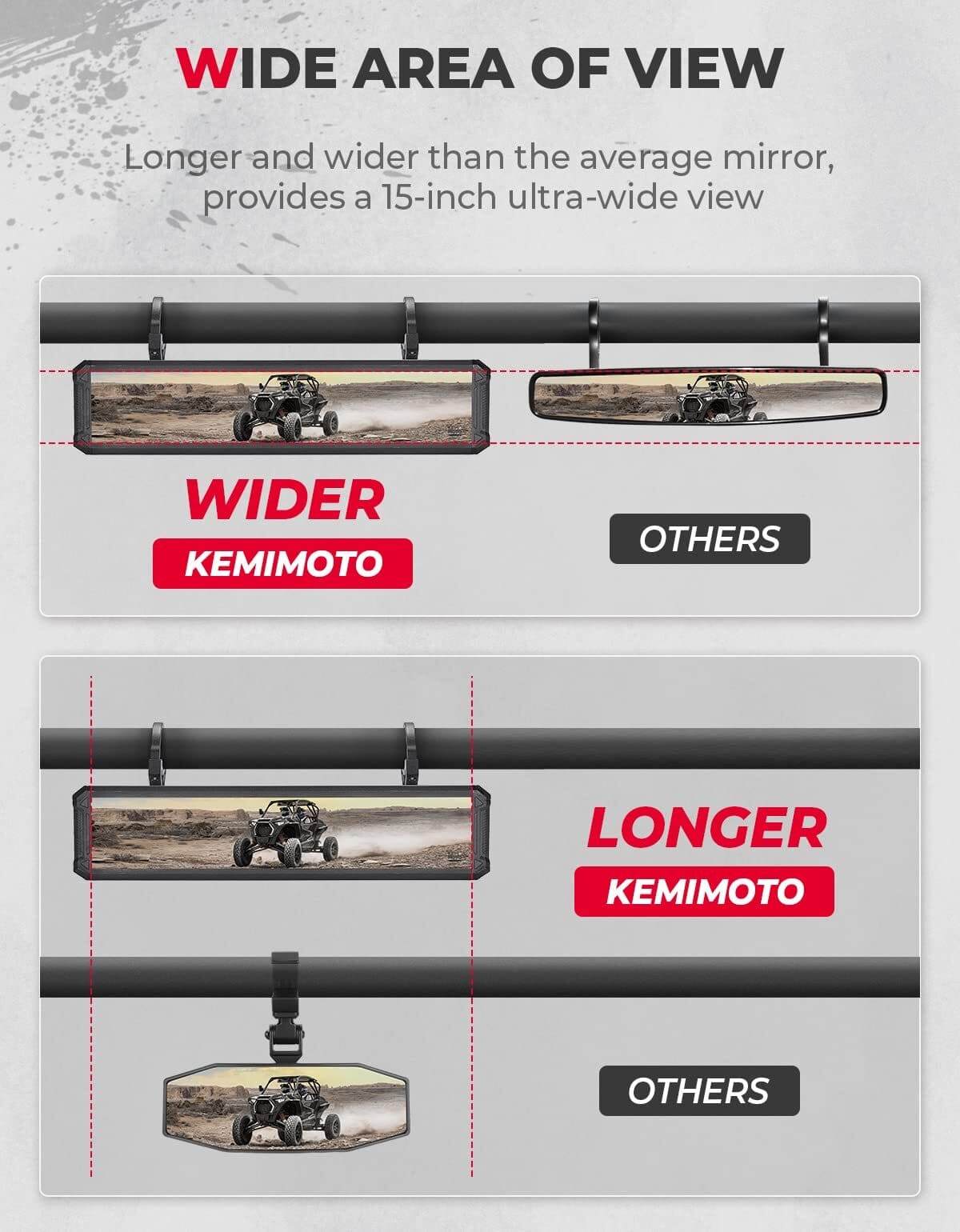 15" Ultra-Wide View: This UTV rear view mirror's large size allows for easy visibility of the entire area behind you. Longer and wider than the average mirror, you can see more than ever before to ensue maximum safety while driving. Without a clear and wide mirror, you will not be able to see many potential dangers during driving.