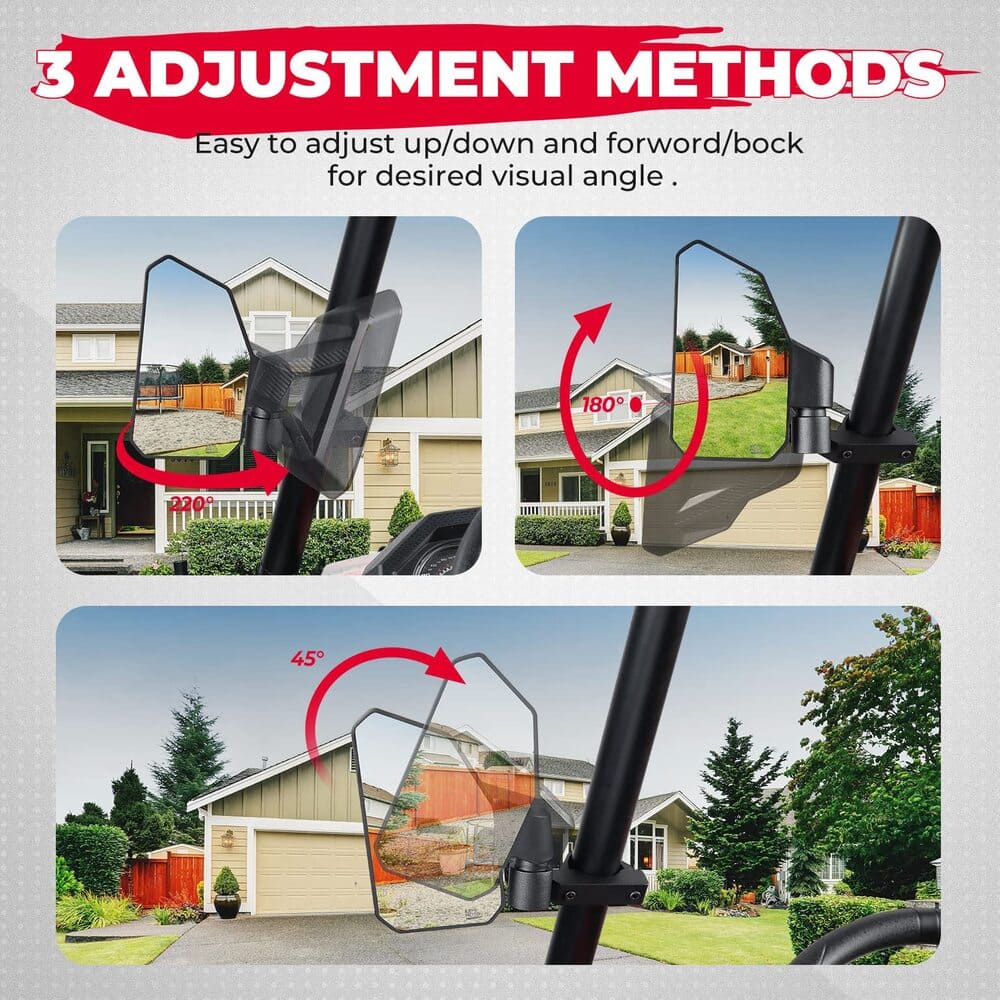 Multi adjust for suitable side view: The Kemimoto SXS side mirrors have 3 adjustable direction that allow you to adjust the mirrors high/low and forward/backward for the desired visual angle. Now you can see behind without looking back.