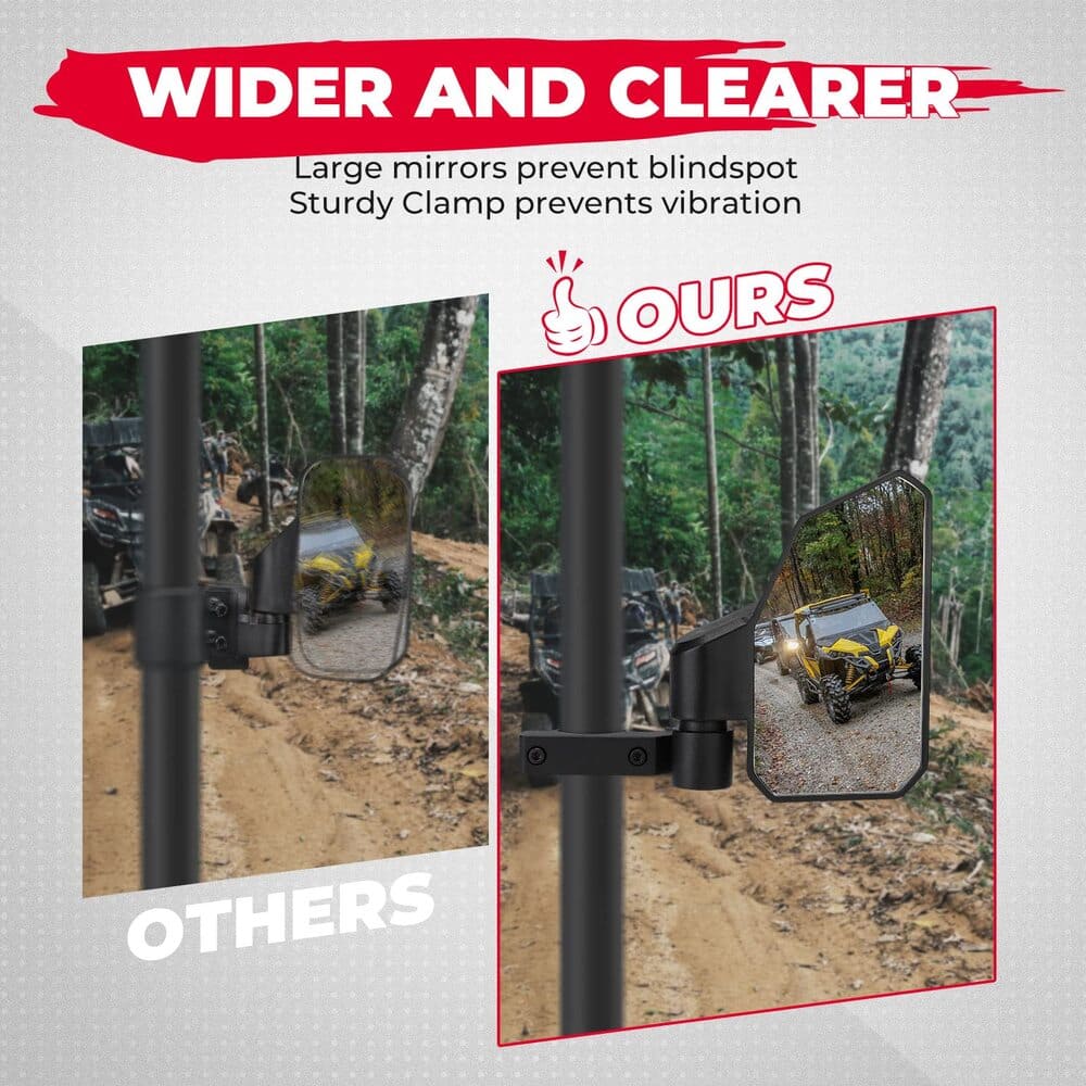 Roll bar clamp for quick install: The anti-slip clamp makes the side by side mirrors be installed without any drill work. Just simply tighten the screws and complete the installation. Sturdy and no vibration.