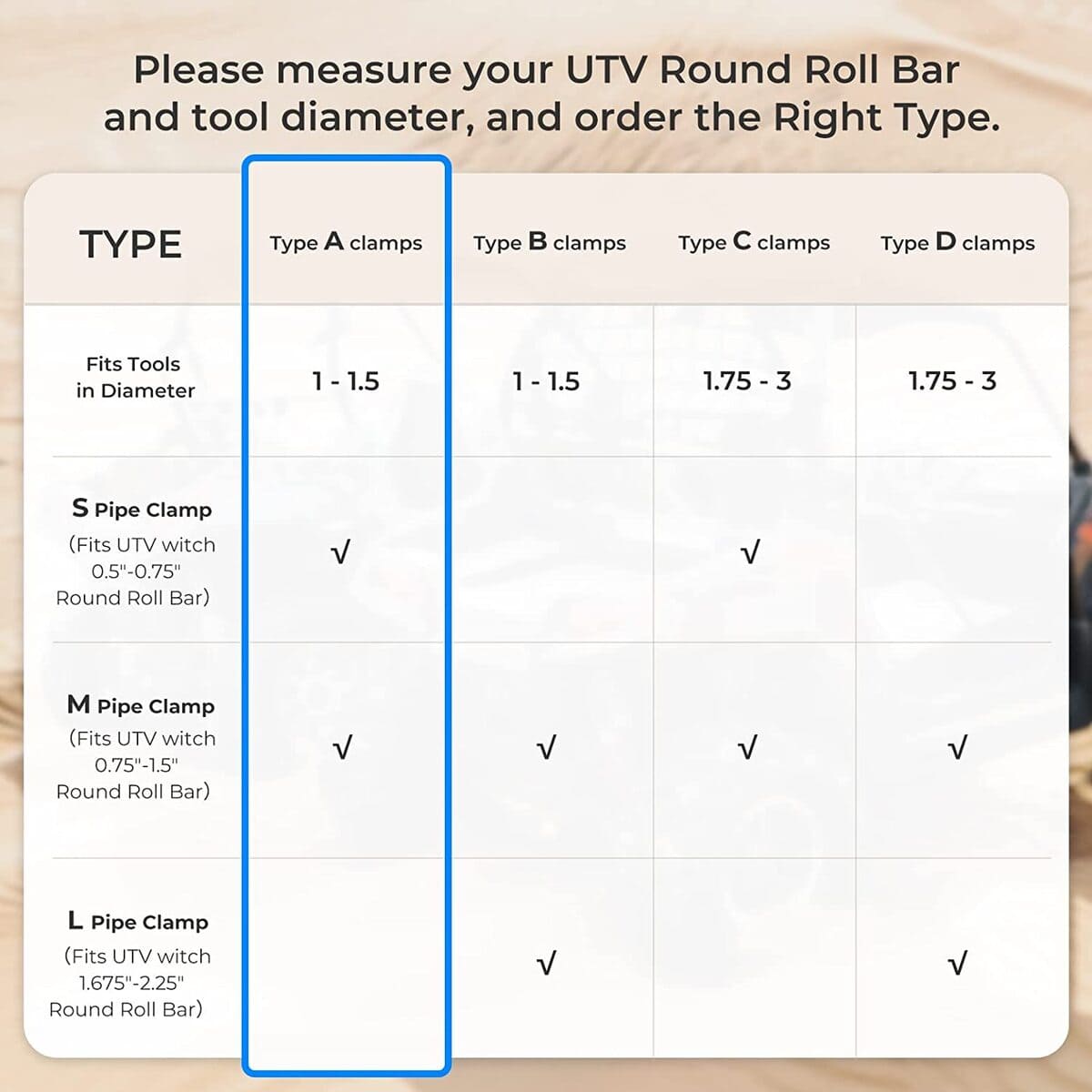 • Wide Compatibility: Rubber Tool Clamp fits ATV UTV with 0.75 inch to 2.25 inch roll bar. The rubber pads make it non-slip on the roll bars. Also Fits RV ladder Jeep off-road adventure with round tube.