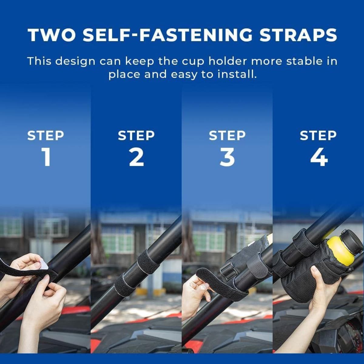 Hold Water Bottle Steady: Additional 2 sticky straps will come with the package to stick on the 1.5"-2" roll bar in order to increase friction and provide extra protection for your bottle even on rough roads or on rails. Please note: If you're planning to use it on luggage or suitcase, install the water cup holder directly instead of using the 2 sticky straps.