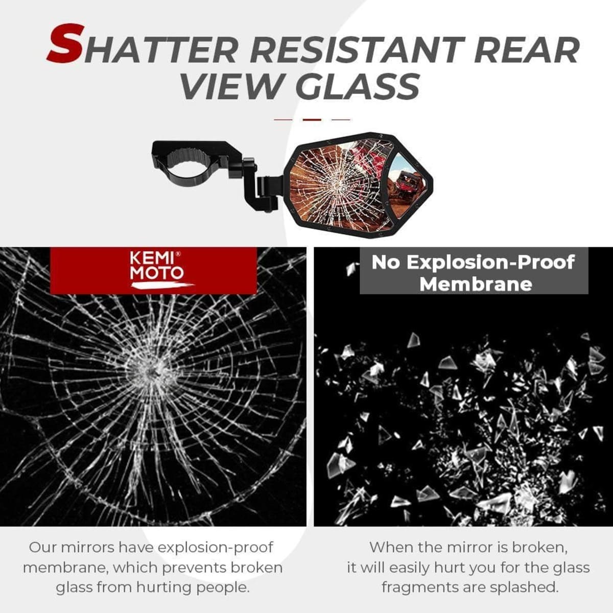 Heavy Duty Aluminum Alloy Housing: 4mm aluminum alloy housing with weather-sealed caps. kemimoto UTV mirror with thickened aluminum alloy housing can greatly reduce the risk of being cracked by your helmet. The anti-shock pad can absorb the shock, and better protect your mirror.