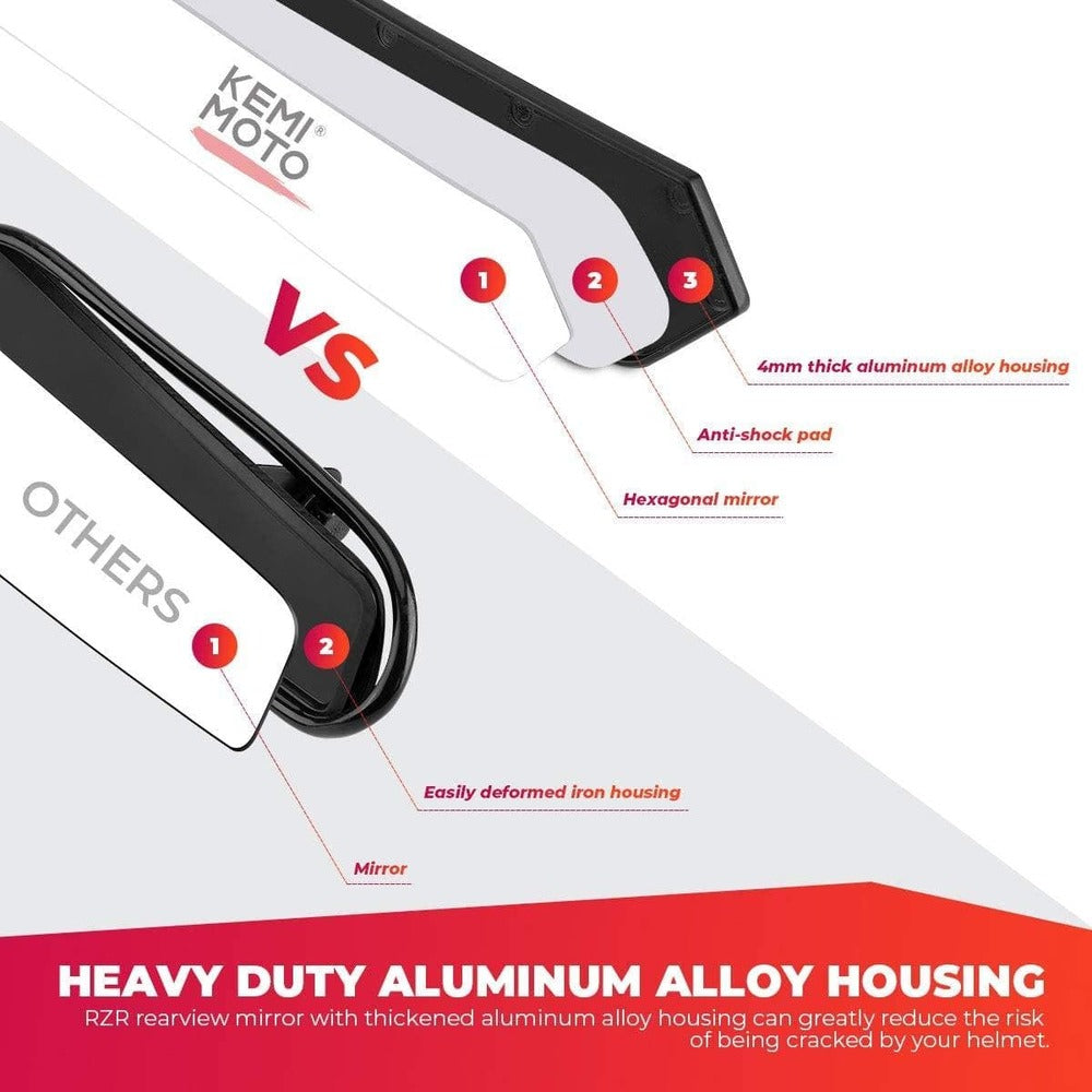 Heavy Duty Aluminum Alloy Housing: 4mm aluminum alloy housing with weather-sealed caps. kemimoto UTV mirror with thickened aluminum alloy housing can greatly reduce the risk of being cracked by your helmet. The anti-shock pad can absorb the shock, and better protect your mirror.