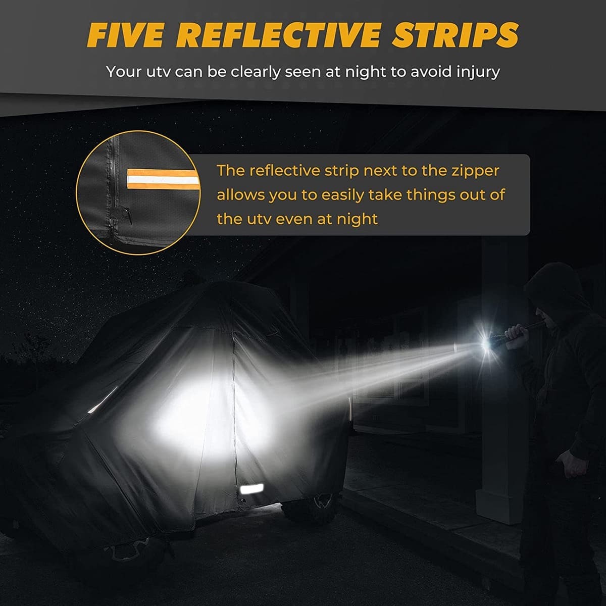 - Five Reflective Strips: It designed with four reflective strips on both sides, increasing the visual of your utv to alarm pedestrians and passing vehicles even at night without street lights. Also one reflective strip near the zipper for easy finding the waterproof zipper.