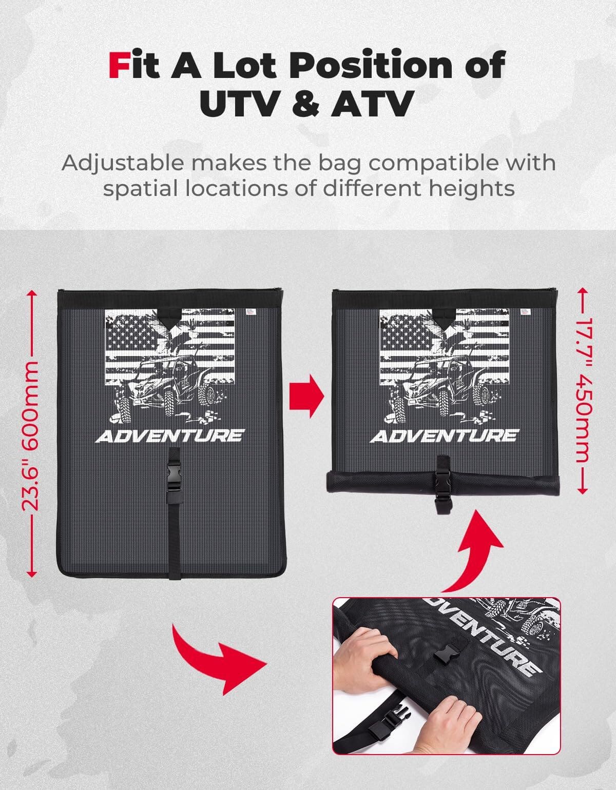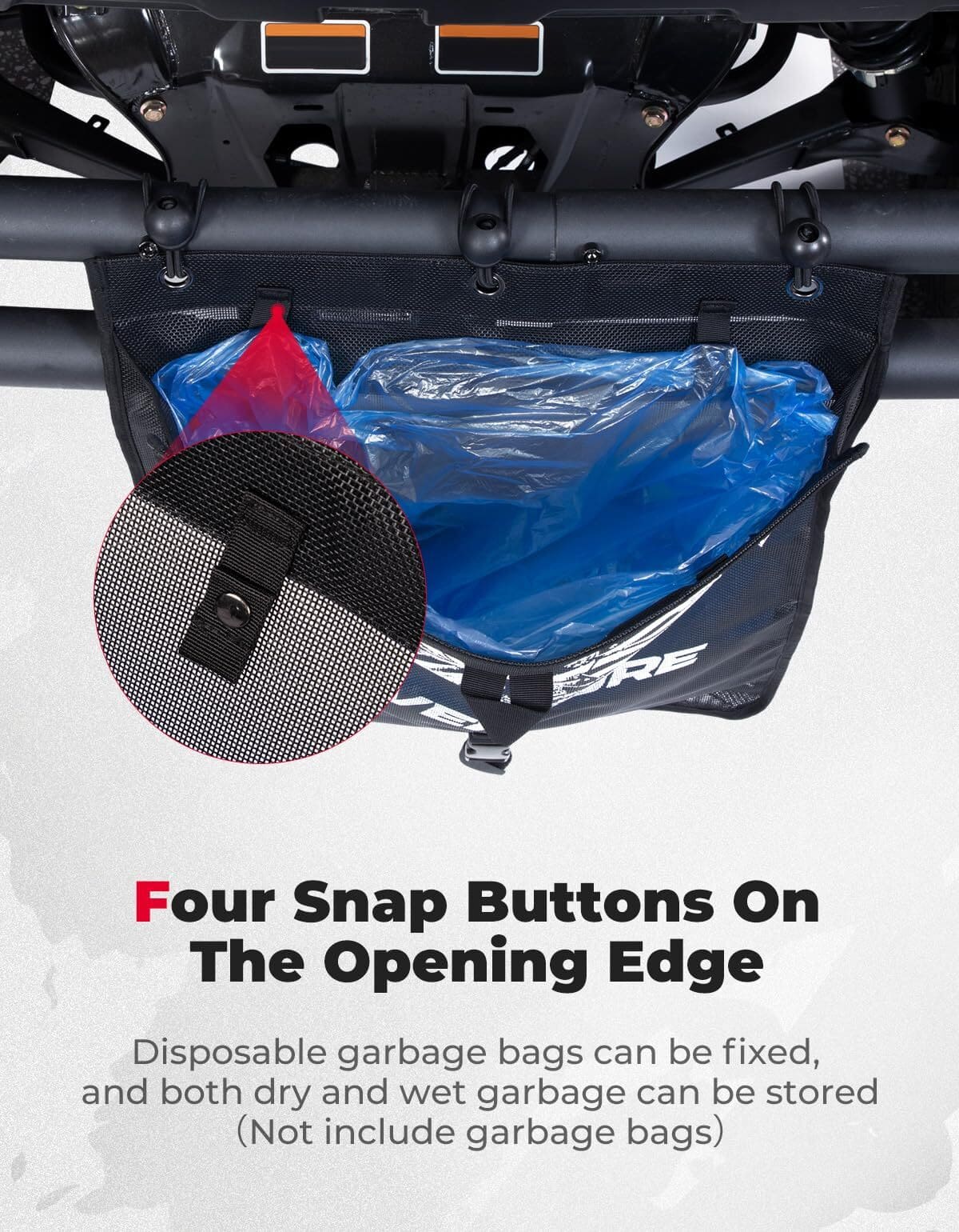 - Multipurpose and Environmentally Friendly: Our UTV Mesh Trash Bag not only helps you keep your vehicle clean, but it also serves as a convenient storage solution for various items during your adventures. Whether you need to stow away tools, camping gear, or personal belongings, this bag has got you covered. You're contributing to environmental preservation.