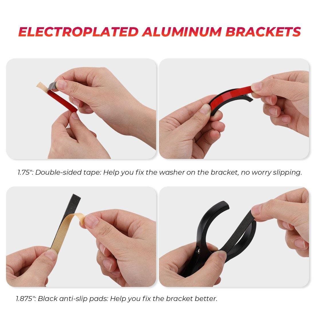 The aluminum bracket with black anti-slip pads can help you fix the 2" roll bar better. The red double-sided tape can help you fix the gasket on the bracket, no worry about slipping.