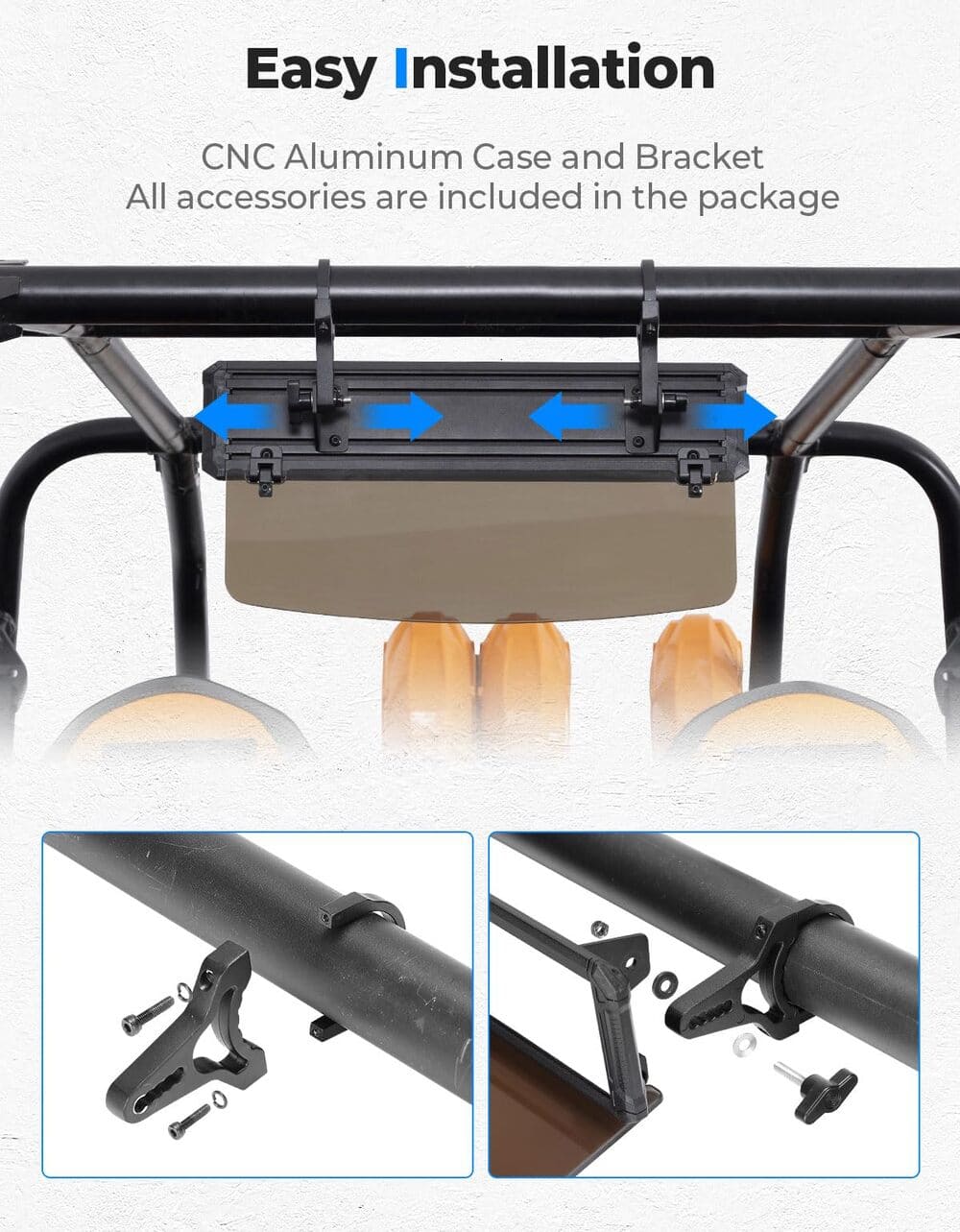 - Sun-Shading Rearview Mirrors: The Alloys 15″ UTV rear view mirror featuring a tinted sun visor, offering 180° adjustability to shield your eyes from the harsh sun. With multiple installation options, customize the mirror to your height for the perfect view.