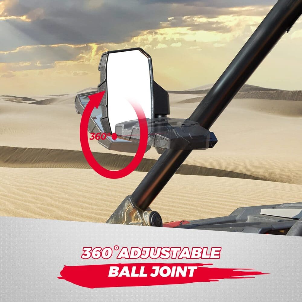 360 Degrees Adjustment: UTV rear view mirrors with 360 Degrees adjustable ball pivot,makes it easier to adjust the angle of UTV mirrors for you need.It helps reduce blind spots and greatly improves driving safety.
