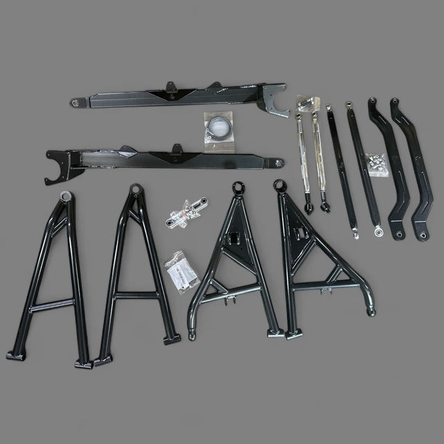 An aftermarket upgrade kit that improves the suspension performance of off-road vehicle. The kit includes a variety of components such as shocks, springs, sway bars, and other suspension hardware that work together to provide better handling, stability, and ride quality on rough terrain. Installing this kit can help to reduce body roll, improve traction, and make the vehicle more capable in challenging off-road conditions.