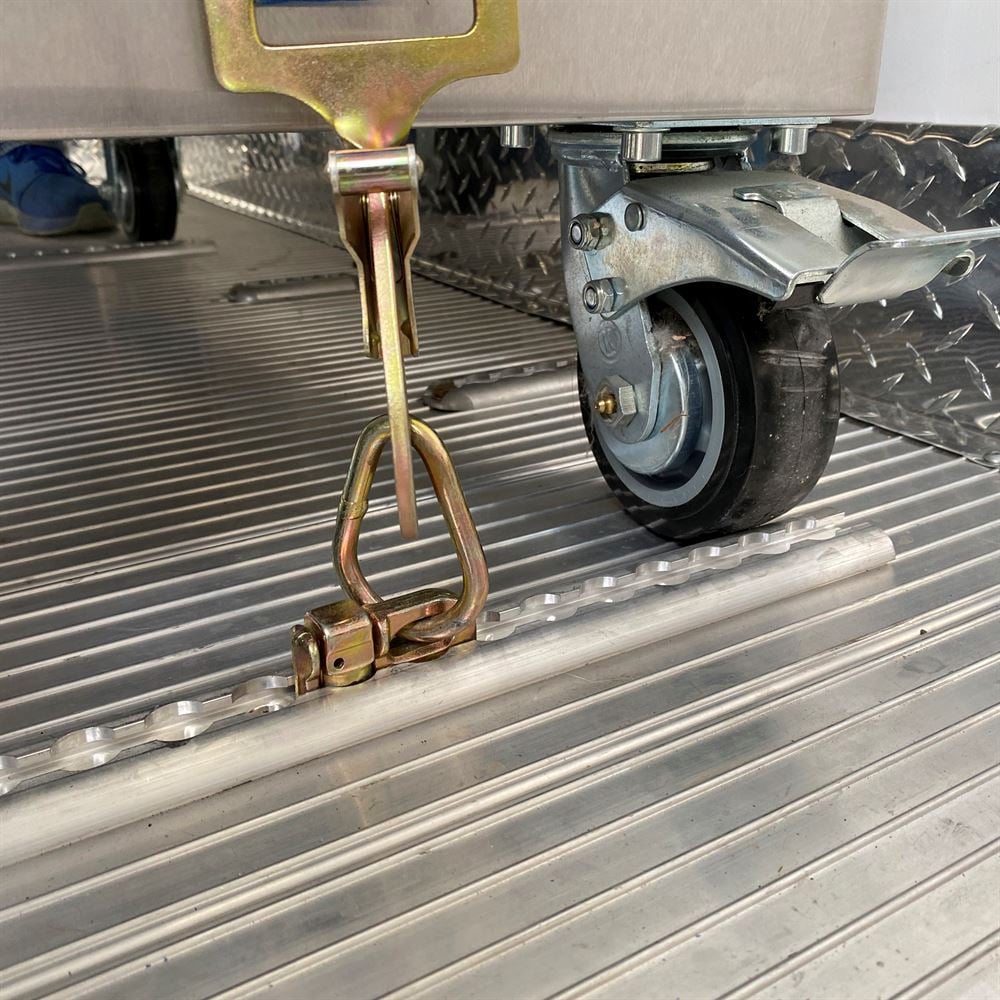 The fitting utilizes a "pear" ring, enabling users to pull it off angle from the track. It is ideal for applications where there are obstructions such as cabinets, walls, etc., located close to the track. The fitting has a weight capacity of 5,000 lbs.