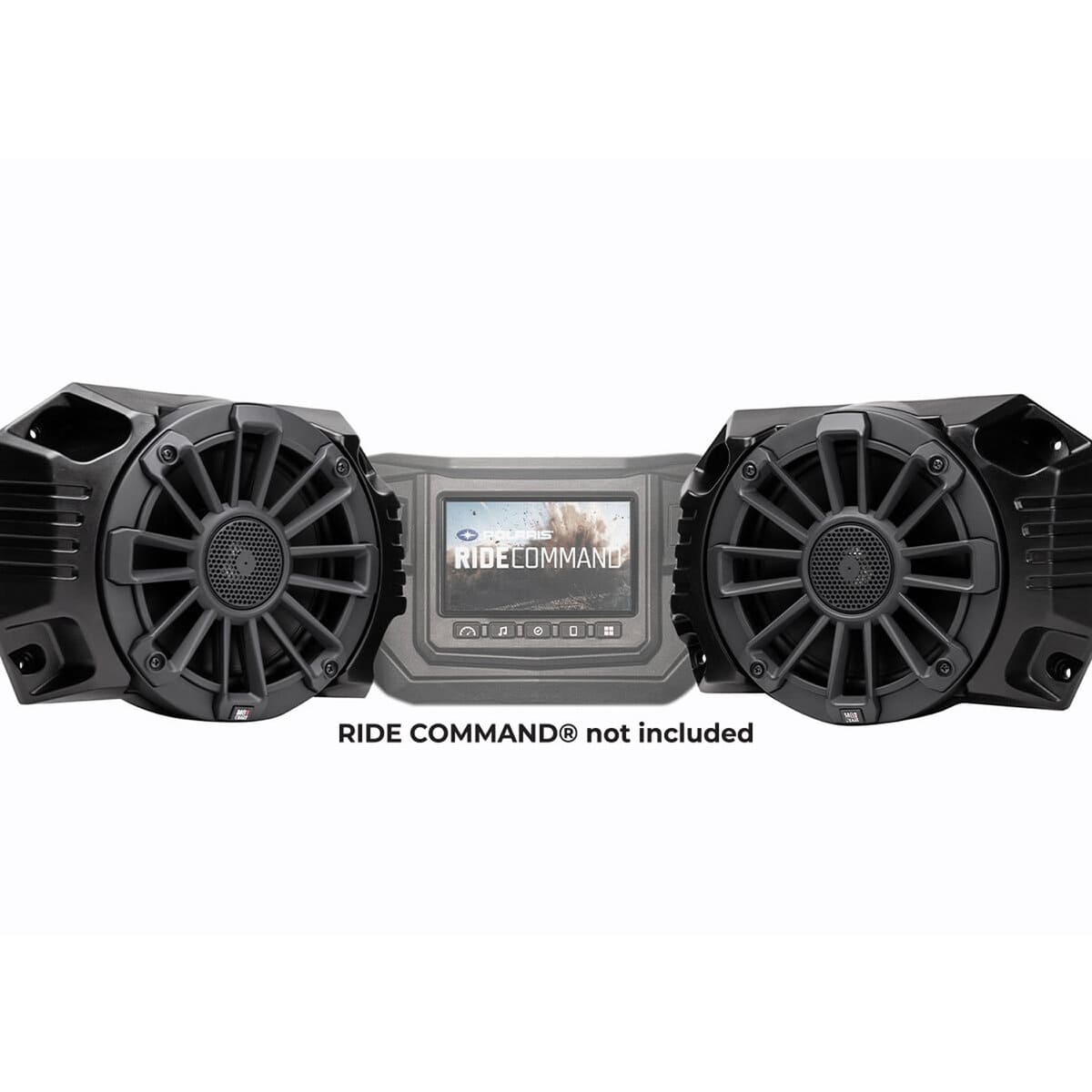 Polaris Ranger 2018-2024 UTV Tuned Audio Package: Two Speaker 400 Watt STAGE 2 Audio System designed to integrate into the vehicle’s Ride Command source unit to control the system which includes one amplifier powering 2 coaxial speakers. All necessary mounting panels and harnessing are included.