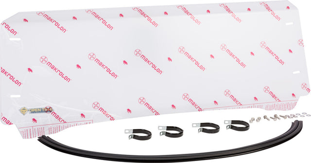 The Open Trail half windshield is made with ultra durable 0.177" Makrolon® Polycarbonate for long lasting, high strength protection and a clear view of the trail. This half windshield is 11" tall. The windshield has a seal at the bottom that rests against your vehicle. It is attached to your roll bars using four galvanized steel, rubber coated P clamps that are bolted to the windshield through pre-drilled holes.