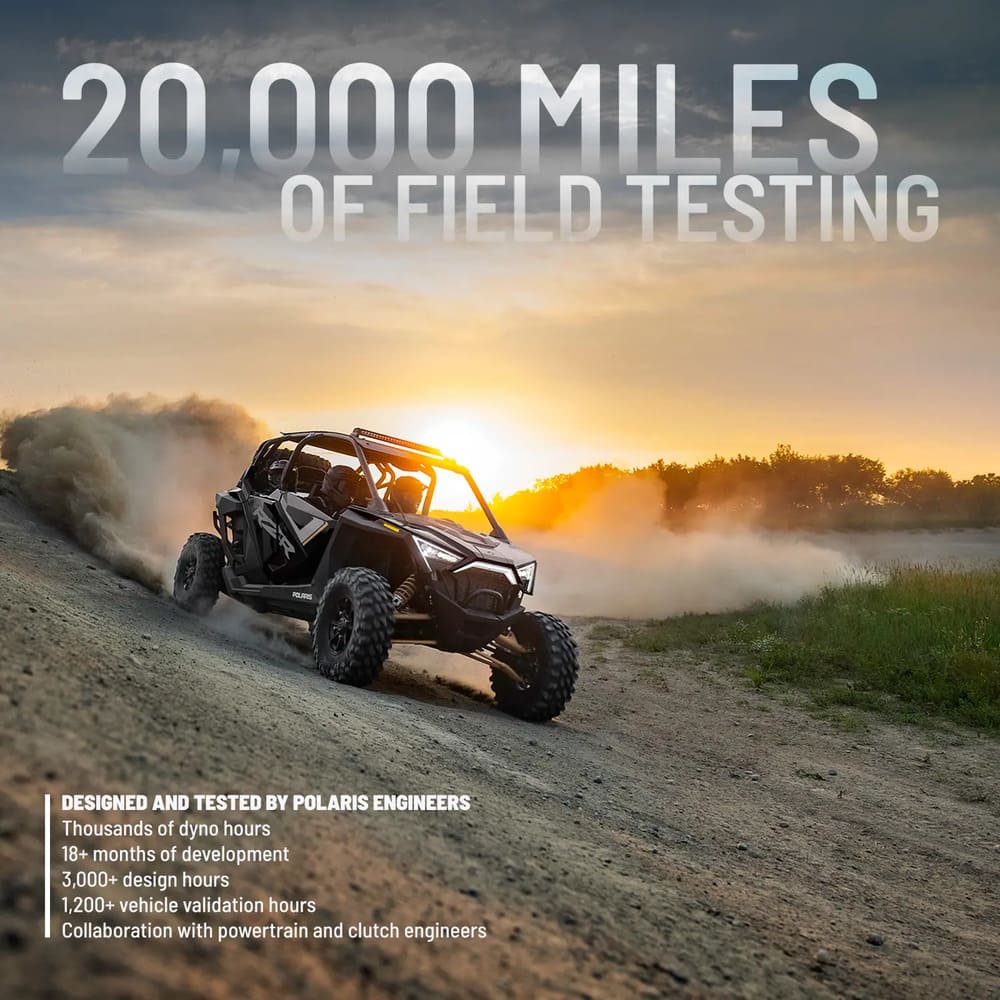 - Extensive Testing: Polaris Belts receive 40,000 miles of field testing, thousands of dyno hours, 18+ months of development (13,000+ design hours) per CVT belt, 1500+ vehicle validation hours, and collaboration with powertrain and clutch engineers.