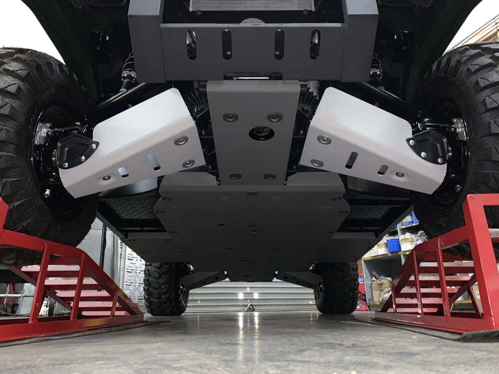 One of the most vulnerable and less protected parts of your Kawasaki Mule PRO-MX / EPS / EPS LE is your A-arms and CV joints. But you can protect both with our 5/32" Marine grade aluminium A-Arm Protectors. With a high folded front edge that protects your A-Arms from impact and your CV Boots from sticks hitting and tearing and letting dirt in there to wreck the joints. We also have drain holes on the underside to let dirt, grass seed, and sand that has built up to fall out or be washed out. Our A-Arm Guards utilize both factory mounting points and steel brackets to give maximum strength when mounting. We also use a stamping procedure to allow extra strength for the A-Arm Guard and for our high strength bolts to be recessed to allow a flat surface for sliding over any obstacle you might come across on the trail. Part Number Only Includes Front a Arm Guards.