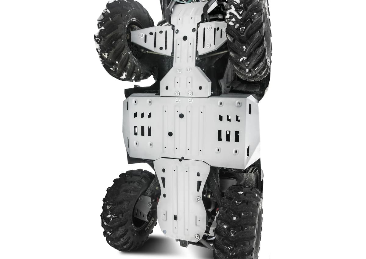One of the most vulnerable and less protected parts of your CF Moto C Force 800 / 800XC / 1000 is your A-arms and CV joints. But you can protect both with our 5/32'' Marine grade Aluminum A-Arm Protectors. With a high folded front edge that protects your A-Arms from impact and your CV Boots from sticks hitting and tearing and letting dirt in there to wreck the joints. We also have drain holes on the underside to let dirt, grass seed, and sand that has built up to fall out or be washed out. Our A-Arm Guards utilize both factory mounting points and steel brackets to give maximum strength when mounting. We also use a stamping procedure to allow extra strength for the A-Arm Guard and for our high strength bolts to be recessed to allow a flat surface for sliding over any obstacle you might come across on the trail. Part number only includes front a-arm guards.