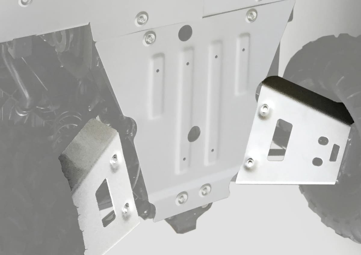 One of the most vulnerable and less protected parts of your Polaris Ranger 570 / 900 / 1000 / Crew / XP is your A-arms and CV joints. But you can protect both with our 5/32'' Marine grade Aluminum A-Arm Protectors. With a high folded front edge that protects your A-Arms from impact and your CV Boots from sticks hitting and tearing and letting dirt in there to wreck the joints. We also have drain holes on the underside to let dirt, grass seed, and sand that has built up to fall out or be washed out. Our A-Arm Guards utilize both factory mounting points and steel brackets to give maximum strength when mounting. We also use a stamping procedure to allow extra strength for the A-Arm Guard and for our high strength bolts to be recessed to allow a flat surface for sliding over any obstacle you might come across on the trail.