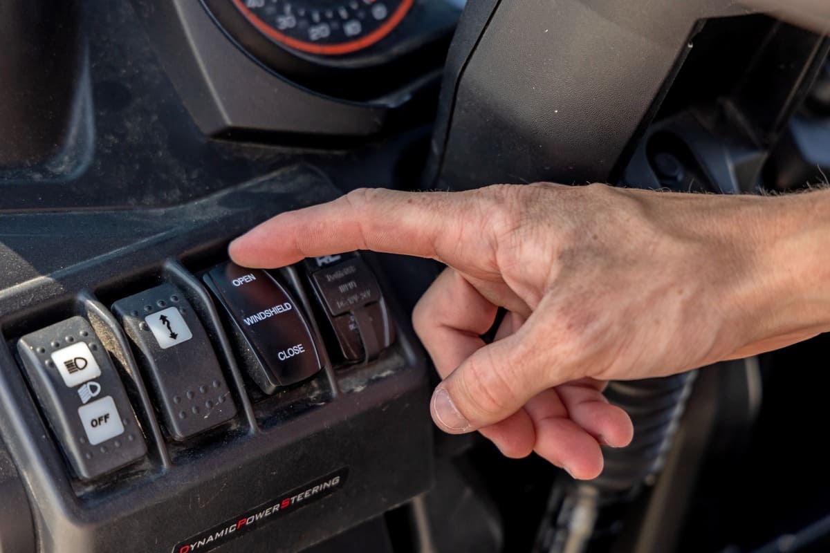 Heavy-Duty Reliability. The Auto-Tilt Windshield is installed in a durable formed frame that fits the contours of your cage and hood perfectly and can withstand all weather conditions. And with weather seal protection, the glass will stay in excellent condition for years to come. It features an easy-to-use rocker switch, so you can open the windshield slightly for minimum airflow or fully open it for maximum airflow. The push-button control with dual linear actuators is so easy to use that you can even adjust mid-ride. The glass is built for long-lasting reliability because the rugged design of your Defender deserves a windshield that is just as tough.