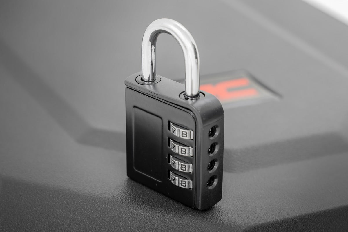 Maximize your storage space: The 45.3-liter (12 Gal) capacity of Rough Country's Bed Mounted Cargo Box ensures you have ample room to store your essential gear, tools, and more. This sleek, durable box secures easily to the side of your Ranger bed railing, keeping your items snugly in place and preventing them from shifting around during your adventures.