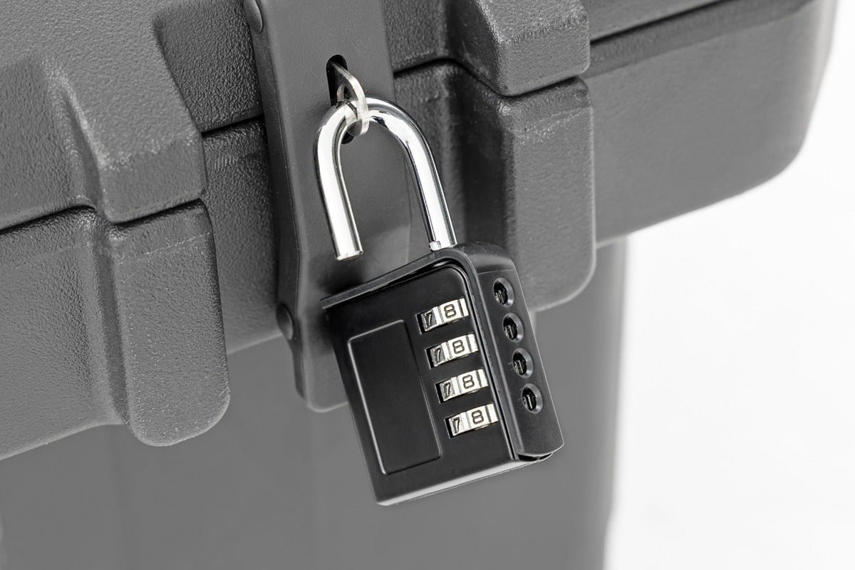 Built for the elements: This cargo box is designed with a waterproof and dust-resistant seal to keep your items protected from the elements. Whether you’re facing rain, mud, or dust, your gear stays safe and dry. Plus, with a four-digit padlock and wire rope, your cargo will be securely locked, giving you peace of mind against theft.