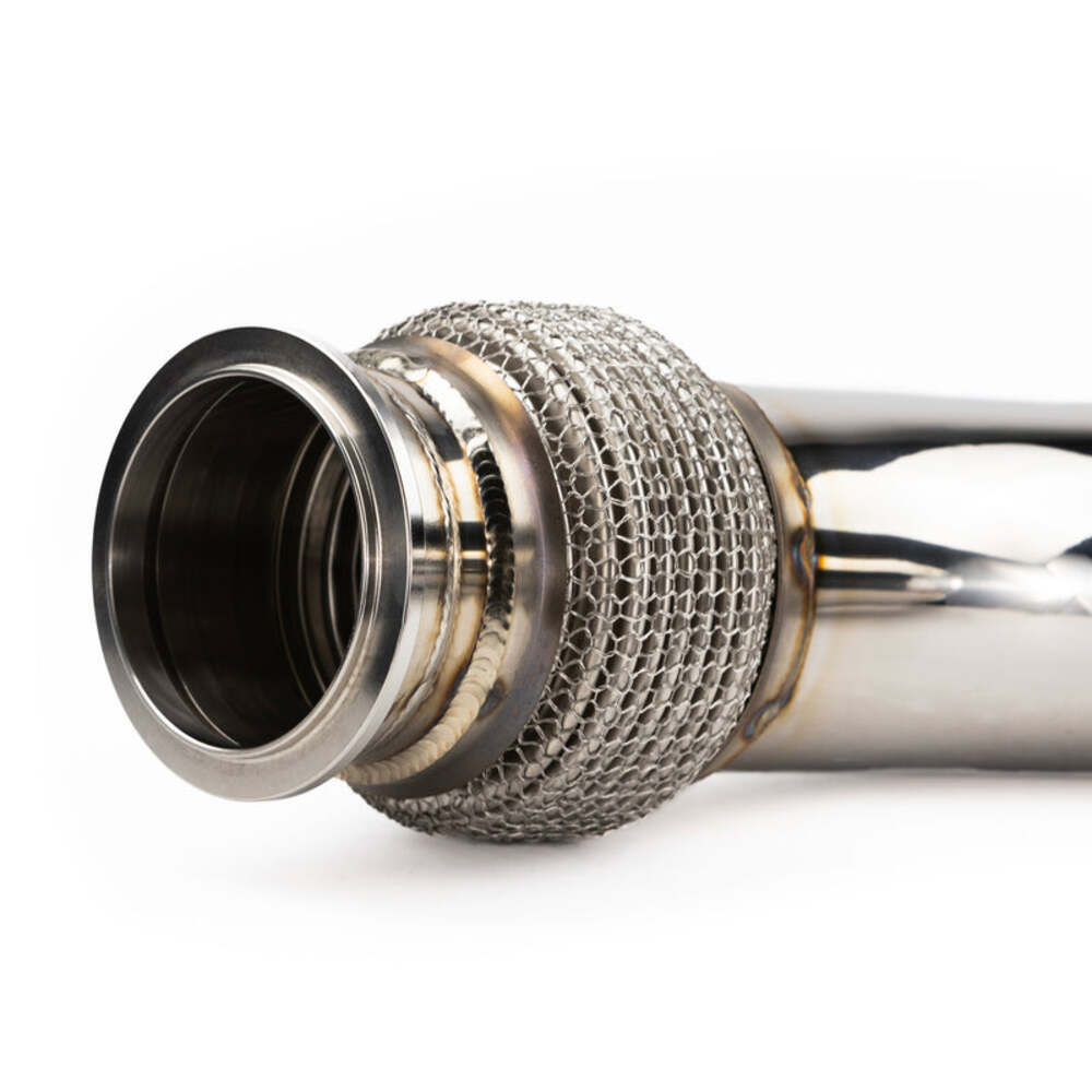 RPM full 3" straight pipe is the go to exhaust for race teams and drag racers. This is an extremely light weight fully stainless exhaust that utilizes a chain link flex pipe to take the abuse that off road racers and drag racers put these through. Along with the chain link flex pipe, we have mounted the exhaust to a factory mounting location in addition to a rubber exhaust isolator. This full 3" stainless exhaust allows your turbo to spool faster and dissipate heat quickly. This is a very loud exhaust, other cars will have no problem hearing you coming! This exhaust is strategically routed to allow for off road racers the full use of their bed and factory muffler area without interfering.