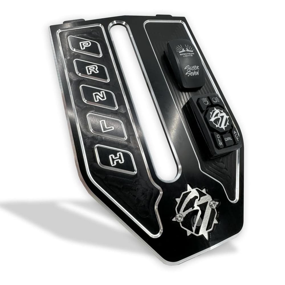 Toss the plastic shift plate in the recycle bin, we bring you the Sector Seven Billet Shift Plate for the highest quality appearance and style, while adding some additional functionality with switch holes. Use the additional switch holes for auxiliary lighting, winch controls, radio/comms and/or a phone mount. Choose from Black, Remachined, and with or without Switch Holes.