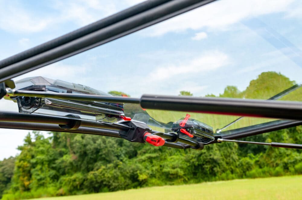 On Hot Days: On hot days, a quick twist of the ergonomic handle opens the windshield smoothly and holds it in the fully open and up position thanks to the two gas-filled struts. Clfvosing is as easy as pulling the windshield back down—the latching mechanisms on the lower corners engage and keep the window closed. Our low-effort, single point release system utilizes 3/4” round tubing and glass filled nylon mounts, creating a less distracting and more elegant profile along the lower edge of the windshield when compared to similar stamped steel systems.