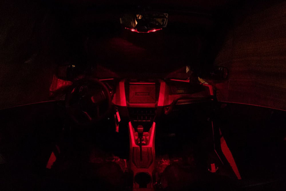 The programmable RGB lights include a high and low intensity level in red, green, and blue color selections. Red and Green LEDs are for use when preserving visual acuity in low light scenarios, while the blue may be used to match dash accent lights.