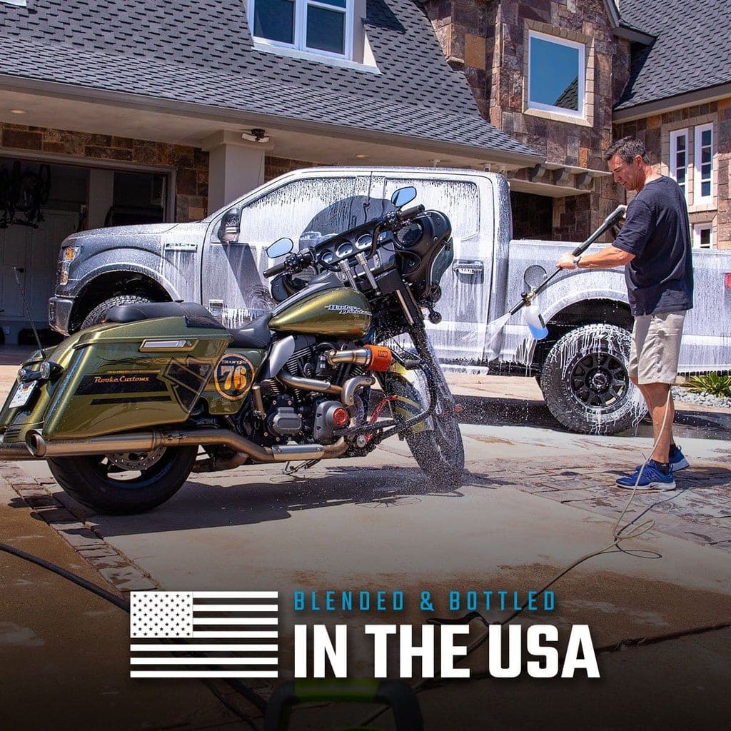Slick Products Hybrid Ceramic Wash & Wax penetrates, softens, and loosens road grime from surfaces. This high-density foaming solution is best used on automotive vehicles and contains hybrid ceramic polymers to disperse water and leave a smooth coating. The concentrated solution must be diluted prior to use and easily applies with a foam cannon or foam gun. Contains a fresh berry scent.