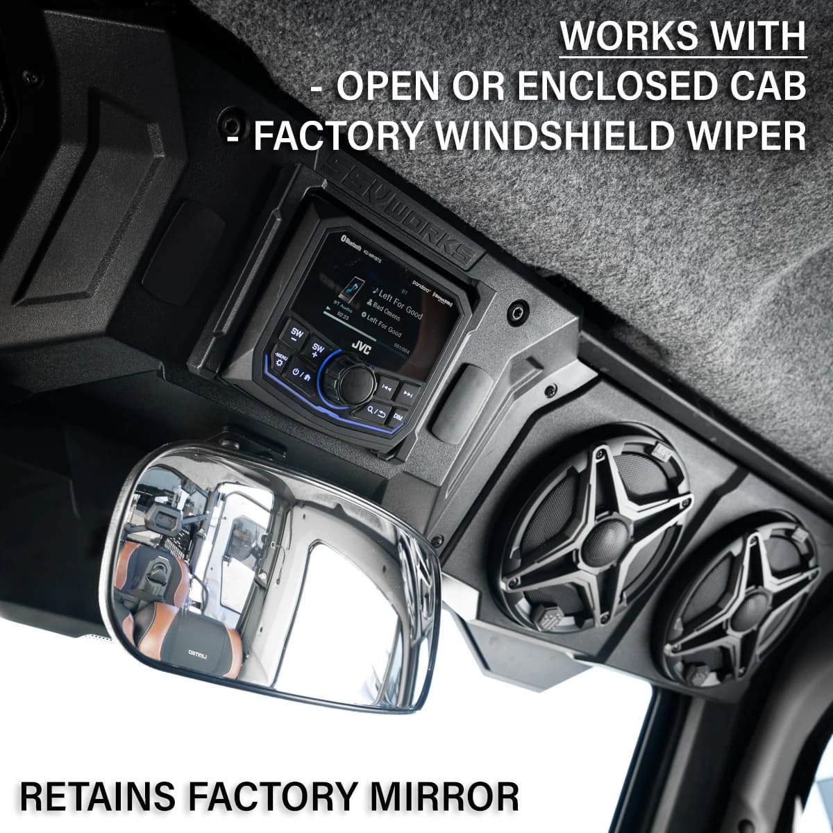 - Complete System: This kit includes everything you need - 4 marine-grade speakers pre-mounted in the overhead enclosure, JVC MR305 Bluetooth head unit, and all necessary wiring harnesses. Just add your Defender and go!