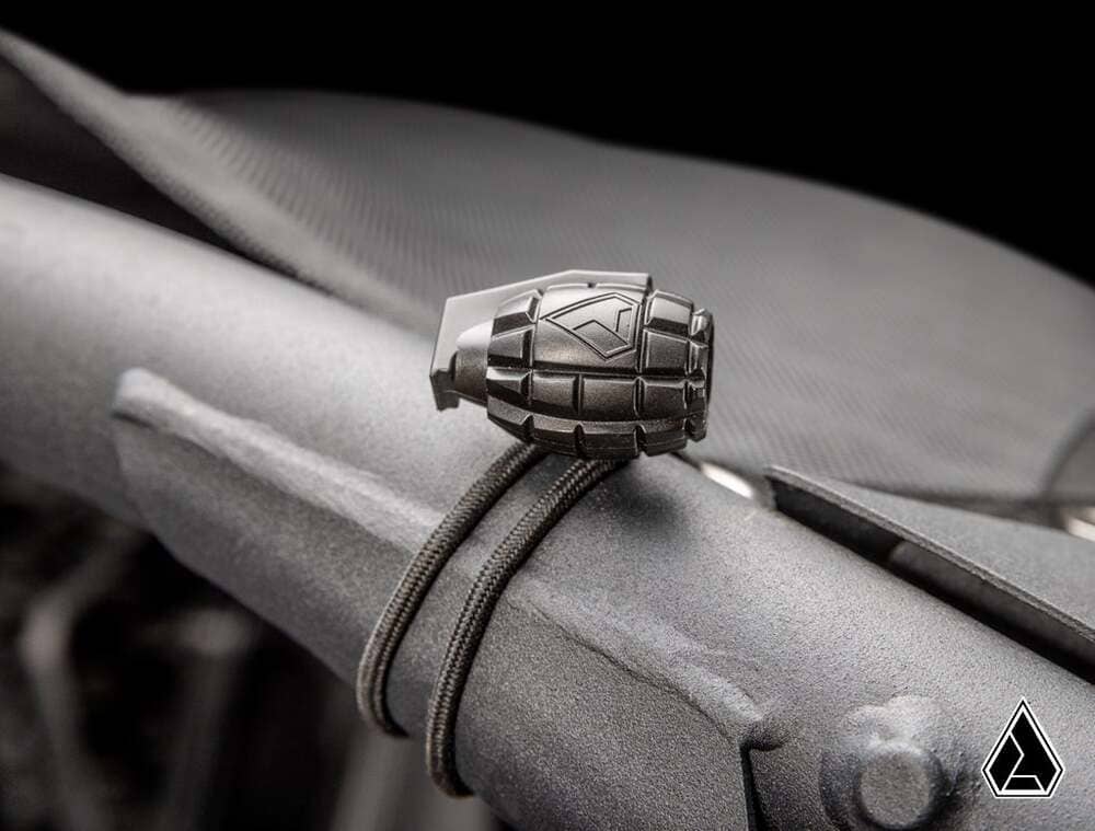 Built to Last: Assault Industries' Can-Am Maverick R shade roof is made with vinyl-coated polyester and uses tie-down bungee cords to keep it tight to your cage. The awesome grenade cord lockers keep it secure even when you’re flying down the trail. Plus, the screen-printed logo gives it the premium finish you expect from Assault Industries.