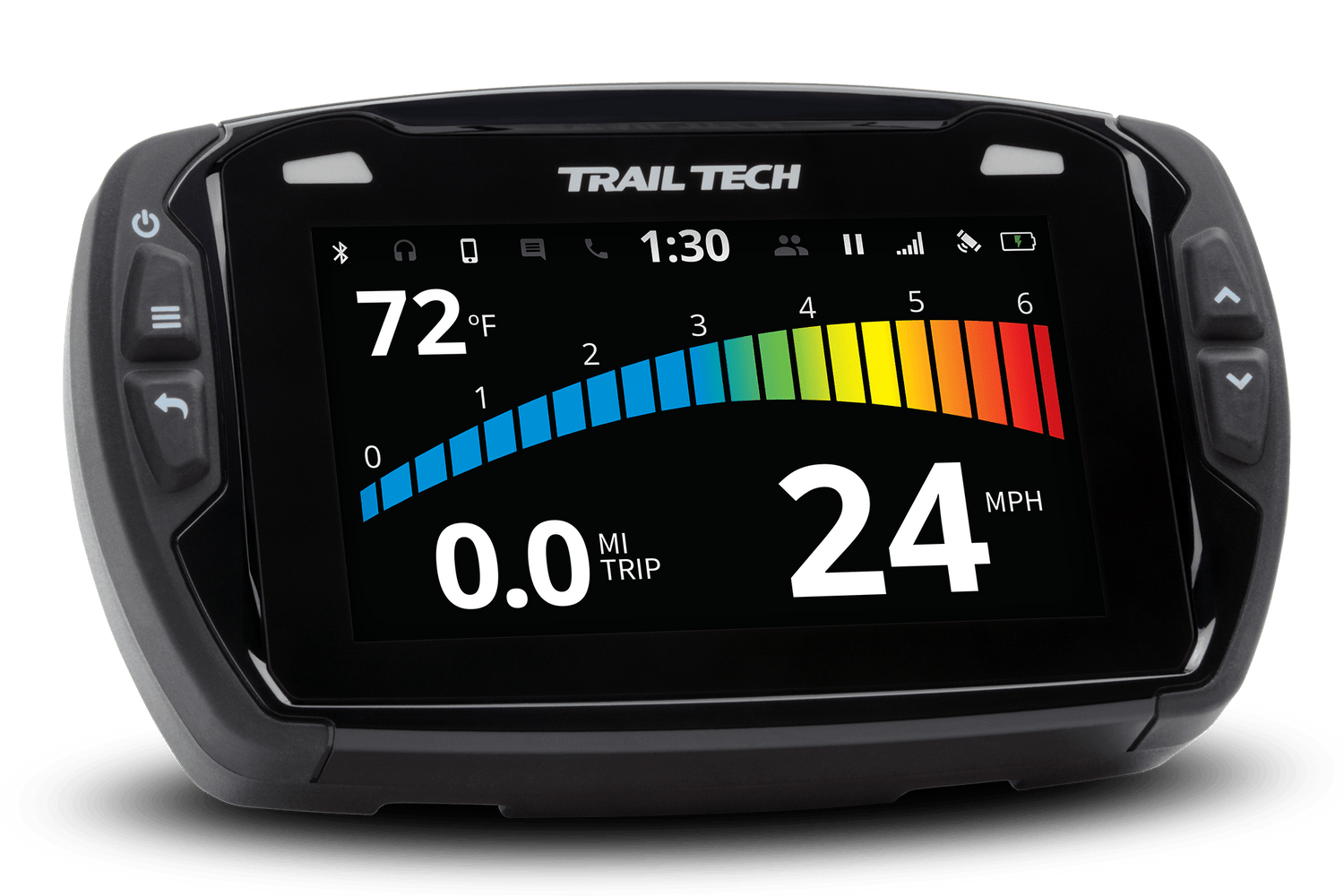 The tach screen is dominated by a large animated tachometer bar graph. It also displays ambient temperature, trip distance and current speed.