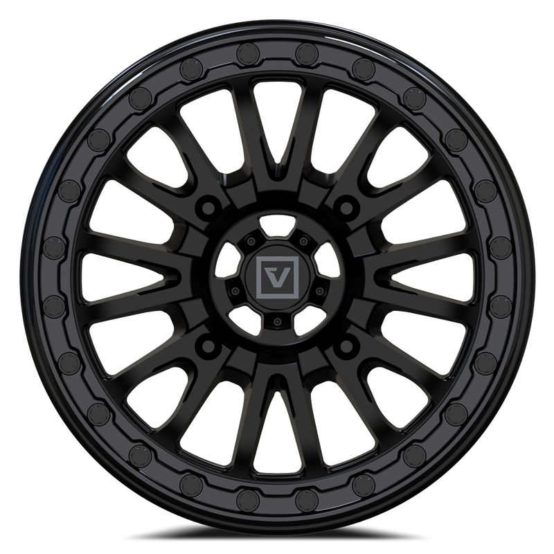 The V16 beadlock UTV wheel by Valor Offroad is available in both Satin Gunmetal and Satin Black. Each wheel is meticulously hand-painted by skilled technicians, ensuring long-lasting protection against the world's harshest trails. V16 Beadlock UTV Wheel features a matching bolt-on satin-black center cap with a satin-charcoal V-Logo and a gloss-black billet beadlock ring.
